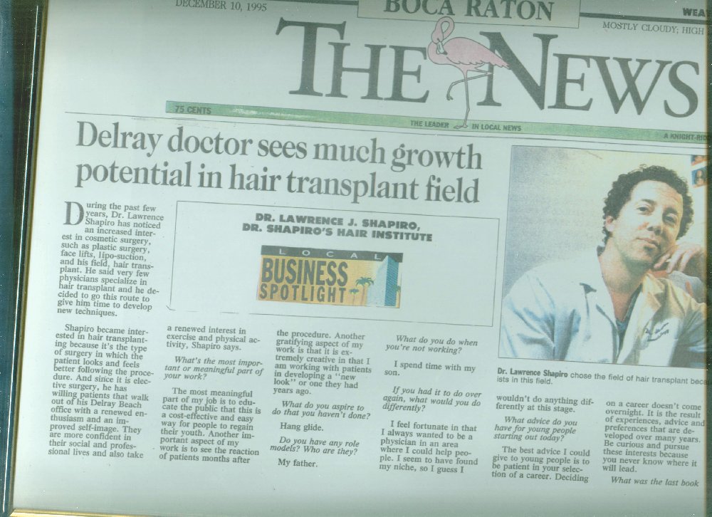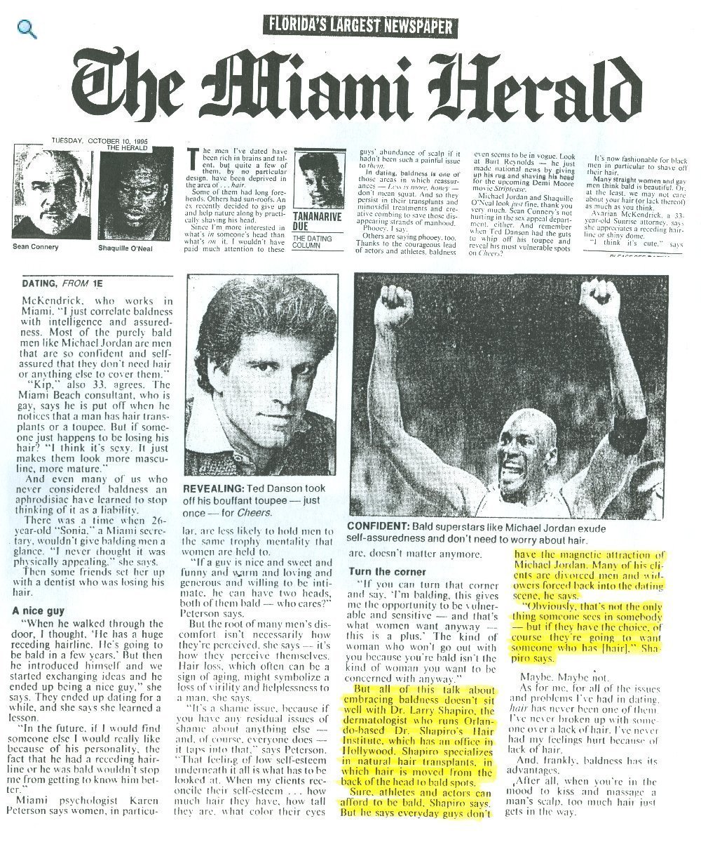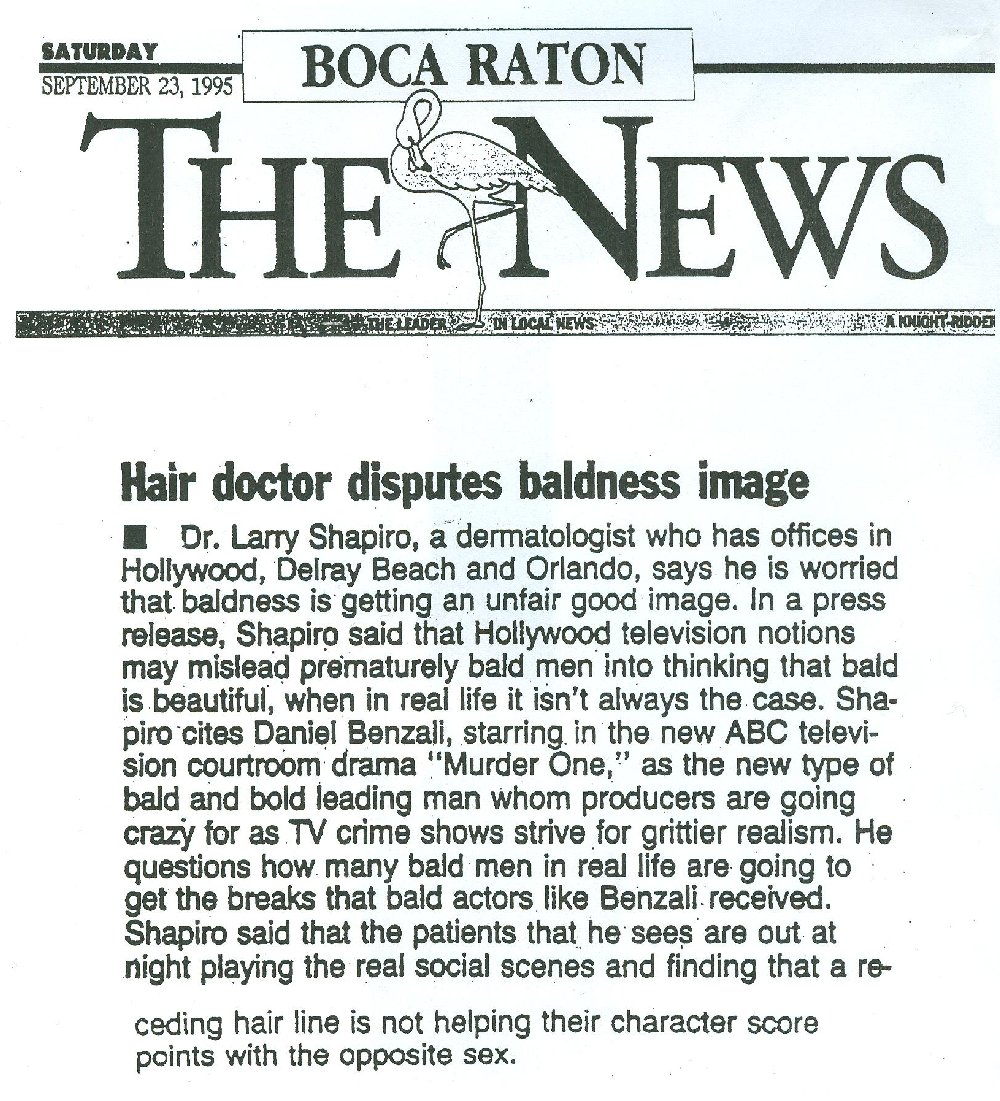 ![]() | Boca Raton, FL: The News: " ... Holly television notions may lead prematurely bald men into thinking that bald is beautiful, when in real life it isn't always the case. ...Shapiro says that the patients he sees are out at night playing the real social scenes and finding that a receding hair line is not helping their character score points with the opposite sex. " |