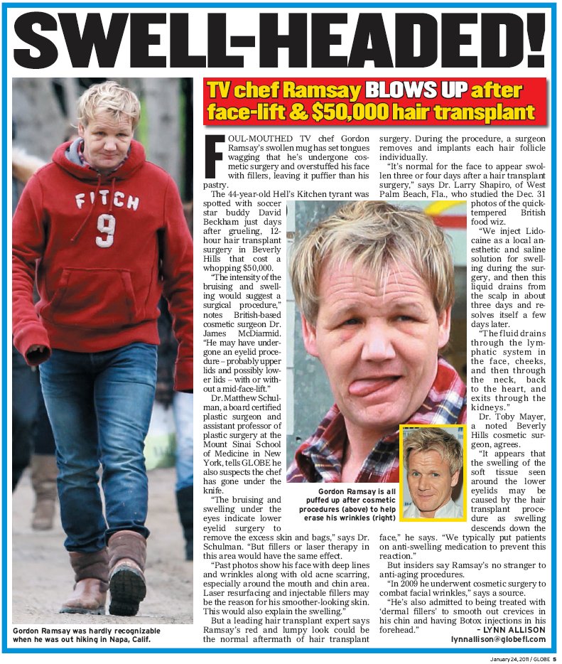 The Globe: Swell Headed: TV chef Ramsey blows up after facelift & $50,000 hair transplant (1/24/11) |